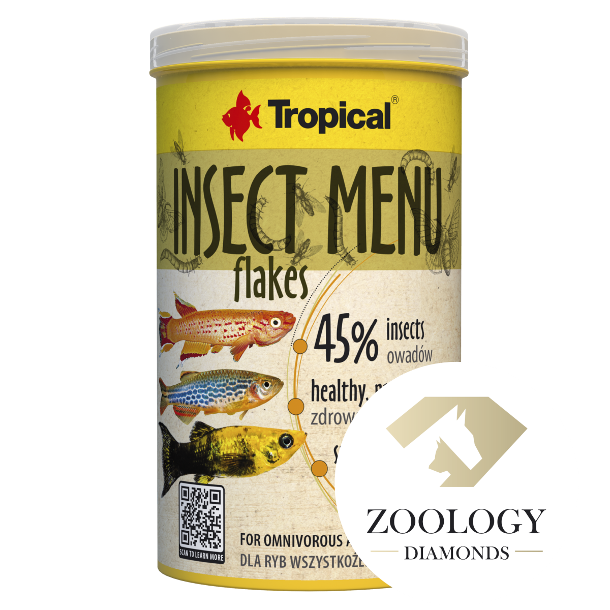 - Multi-ingredient food in the form of flakes based on 3 insects: hermetia (15%), silkworm (15%) and mealworm (15%) for omnivorous and carnivorous fish