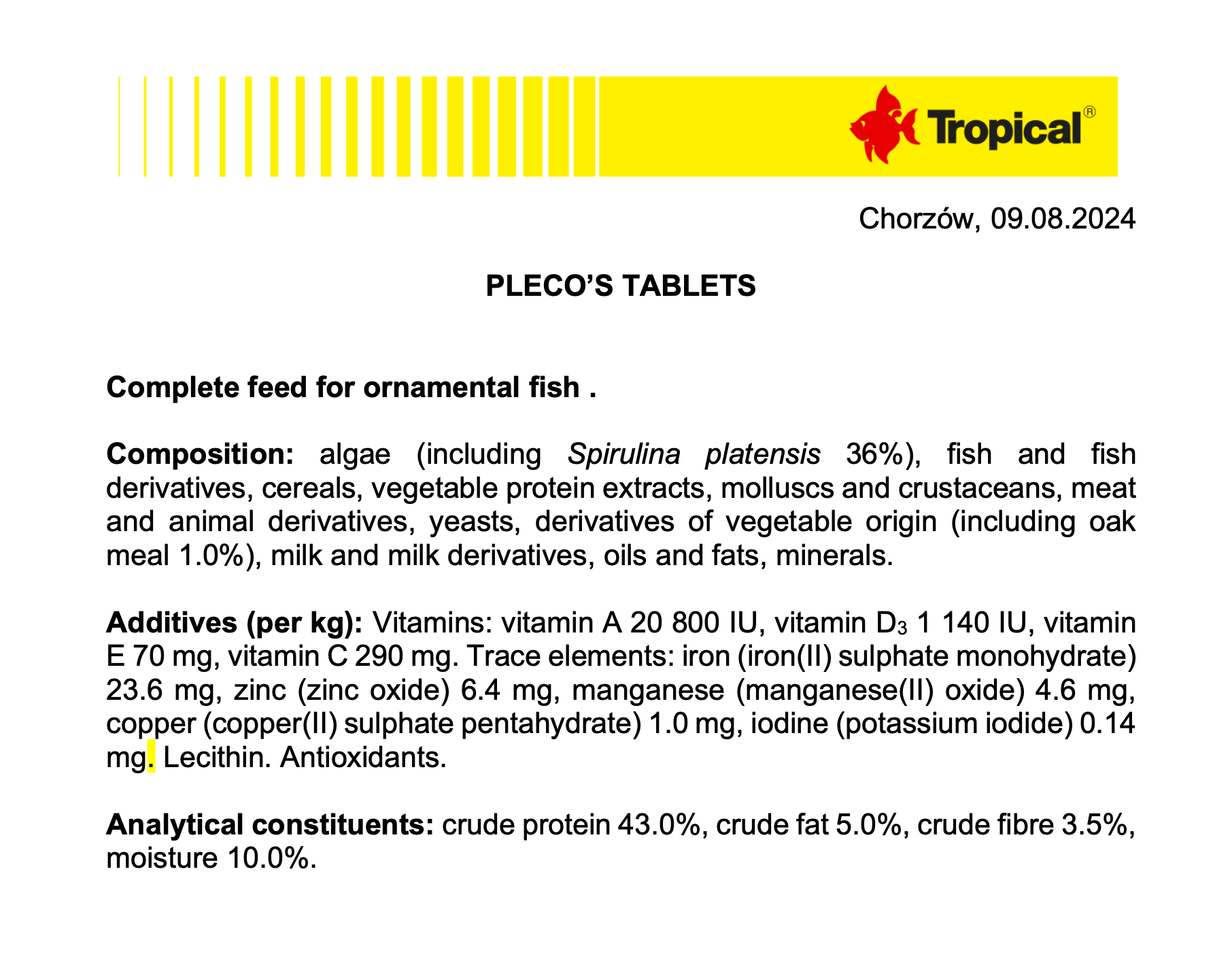 - PLECO'S TABLETS contain 36% spirulina, which provides easily digestible protein, natural carotenoids and active substances stimulating fish's immune system.